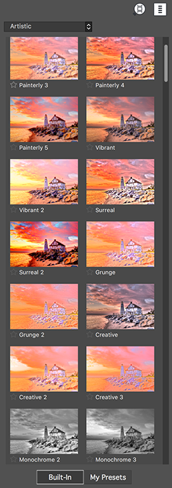 In der Dropdown-Liste oben im Vorgaben-Bedienfeld können Sie Vorgaben nach Kategorien filtern. Es gibt vier Kategorien integrierter Vorgaben, die den Effektstilen entsprechen (Künstlerisch, Realistisch, Architektur und Schwarz & Weiß) und vier Kategorien, die HDR-Rendermethoden entsprechen (Details Enhancer, Contrast Optimizer, Tone Balancer, Tone Compressor und Fusion).