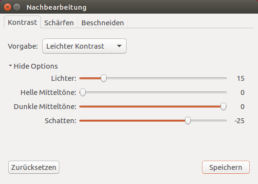 Bevor Sie das Bild speichern, können Sie die Optionen im Dialogfeld Nachbearbeitung verwenden, um den Kontrast Ihres Bildes zu erhöhen, es zu schärfen oder zuzuschneiden.