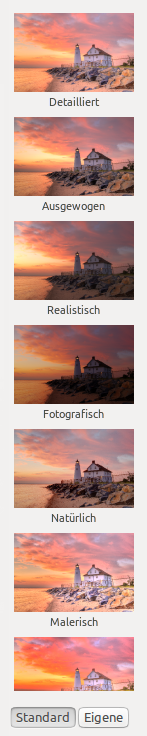 Wählen Sie einen Stil aus, indem Sie eine Miniatur im Bedienfeld Vorgaben auswählen. Verwenden Sie entweder eine Standardvorgabe, die mit Photomatix für Linux ausgeliefert wurde, oder eine eigene Vorgabe, die Sie zuvor selbst erstellt haben.