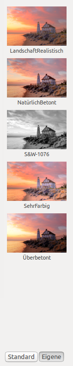 Standardvorgaben sind Vorgaben, die mit der Software mitgeliefert werden. Photomatix für Linux enthält 37 Standardvorgaben für Belichtungsreihen und 33 Standardvorgaben für die Bearbeitung eines einzelnen Fotos.