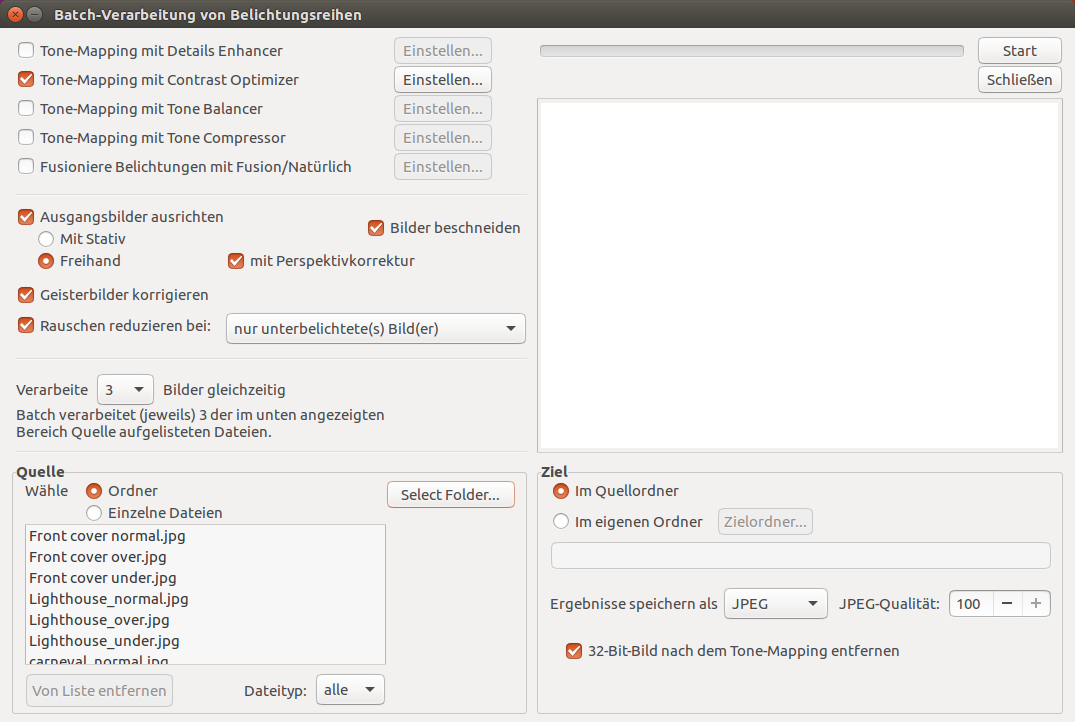 - Im Bereich Quelle legen Sie fest, wo sich Ihr Ordner mit den Belichtungsreihen befindet. Die Dateien sind in alphabetischer Reihenfolge sortiert. Es werden jeweils "N" Dateien zusammen verarbeitet, die Anzahl "N" hatten Sie im vorherigen Schritt festgelegt.