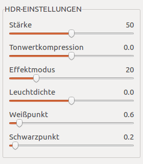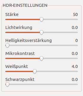Erhöht den Detailkontrast und den Schärfeeindruck des Bildes. Die Erhöhung des lokalen Kontrastes hat den Nebeneffekt, dass das Bildrauschen stärker hervortritt und dass sich feine Halo-Effekte an Kanten mit hohen Helligkeitsunterschieden bilden können. Werte nahe dem Maximum ergeben eher surreale Bildwirkungen. Der Standardwert ist 2.