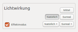 Lässt Sie zwischen zwei verschiedenen Modi für die Steuerung der Lichtwirkung auswählen, die jeweils geringfügig unterschiedliche Ergebnisse liefern. Bei ausgewählter Checkbox ergeben sich Bilder mit einer eher 'magischen' Bildwirkung. Beachten Sie, dass in diesem Modus eine feinere Steuerung nicht möglich ist.