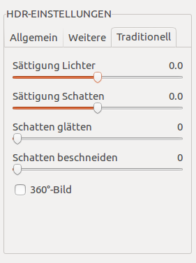 Regelt die Helligkeit des fusionierten Bildes, indem der Einfluss eines jeden Ausgangsbildes auf das fertige Bild angepasst wird. Das Bewegen des Reglers nach rechts bevorzugt die überbelichteten Bilder mehr und macht das Bild heller. Das Bewegen des Reglers nach links betont die unterbelichteten Bilder und macht das Bild dunkler.