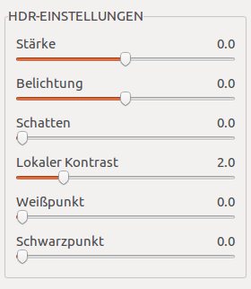 Legt fest, wie sehr lokale Kontraste verstärkt werden. Das Bewegen des Reglers nach rechts hellt die Schatten auf und zeigt mehr Details in den Lichtern. Das Bewegen des Reglers nach links ergibt ein 'natürlicheres' Aussehen.