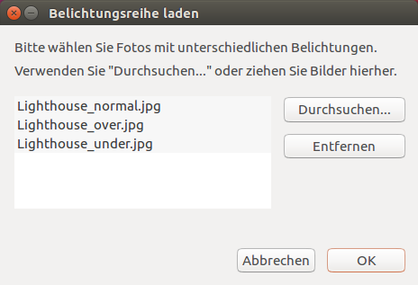 Dialogfeld Belichtungsreihe laden mit 3 Quellfotos
