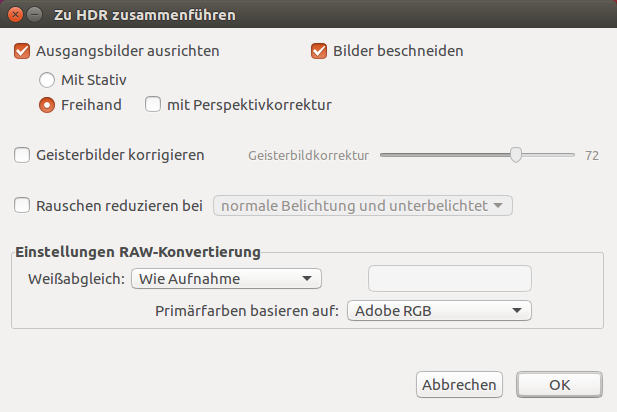 Photomatix für Linux bietet zusätzliche Einstellungen für Raw-Dateien. Diese Einstellungen sind automatisch verfügbar, wenn Raw-Dateien geladen wurden.