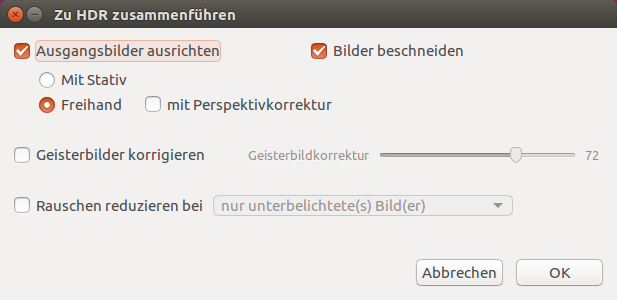 Der Dialog Zu HDR zusammenführen bietet Optionen zur Korrektur von Ausrichtungsfehlern und Geisterbildern, die bei Belichtungsreihen auftreten können.