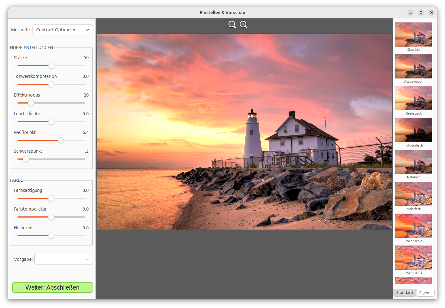 Wenn Sie mit dem Vorschauergebnis zufrieden sind, klicken Sie auf die Schaltfläche Weiter: Abschließen am unteren Rand des Bedienfeldes. Die gewählte Vorgabe und deren Einstellungen werden nun auf das Bild in Originalauflösung angewendet.