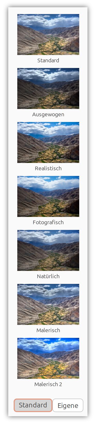 Standardvorgaben sind Vorgaben, die mit der Software mitgeliefert werden. Photomatix für Linux enthält 37 Standardvorgaben für Belichtungsreihen und 33 Standardvorgaben für die Bearbeitung eines einzelnen Fotos.