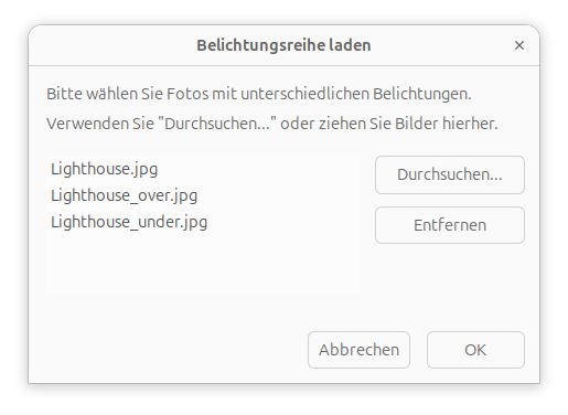 Dialogfeld Belichtungsreihe laden mit 3 Quellfotos