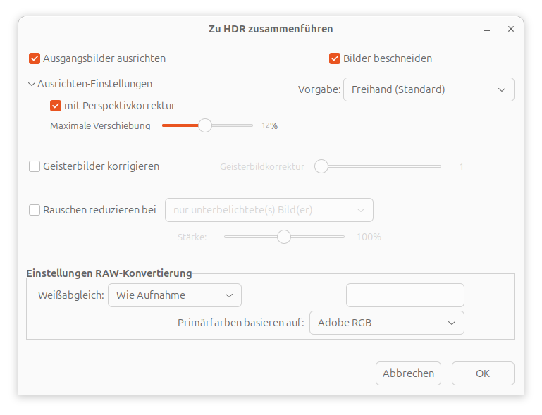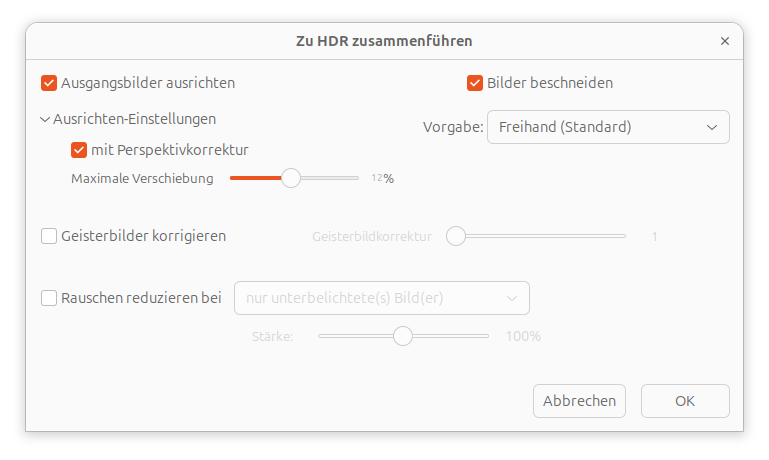 Der Dialog Zu HDR zusammenführen bietet Optionen zur Korrektur von Ausrichtungsfehlern und Geisterbildern, die bei Belichtungsreihen auftreten können. Es bietet auch Optionen zur Rauschunterdrückung und Raw-Konvertierung (wenn Raw-Dateien geladen sind), die auch beim Laden eines einzelnen Fotos zur Verfügung stehen.
