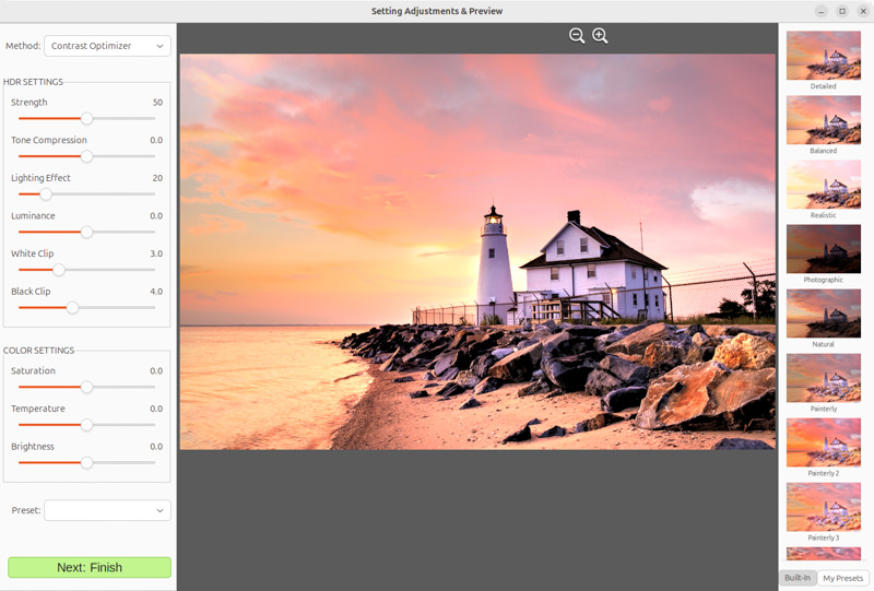 When you are satisfied with the preview result, click on the Next: Finish button at the bottom of the Adjustments panel. This will apply the selected preset and settings adjustments to the image, at its original resolution.