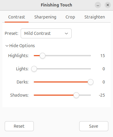 The Contrast and Sharpen tabs of the Finishing Touch window provide "Mild", "Medium" and "Strong" presets (and "Extreme" as well, for Contrast). The "Show Options" button gives access to options for more precise custom settings.