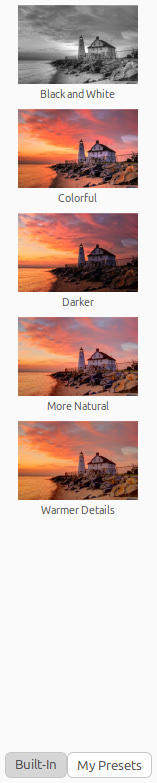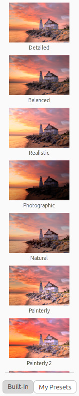 Built-in or "factory" presets are those provided with the software. Photomatix for Linux offers 37 built-in presets when you are working with bracketed photo sets, and 33 built-in presets for when you are working with single photo files.